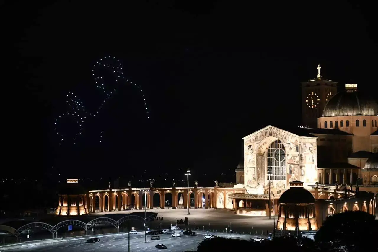 O Santuário Nacional de Aparecida foi palco, neste sábado (26), de uma emocionante homenagem ao Papa Francisco. Um espetáculo de luzes com 100 drones emocionou os milhares de fiéis reunidos no pátio da Basílica, relembrando a profunda ligação do pontífice com a padroeira do Brasil.